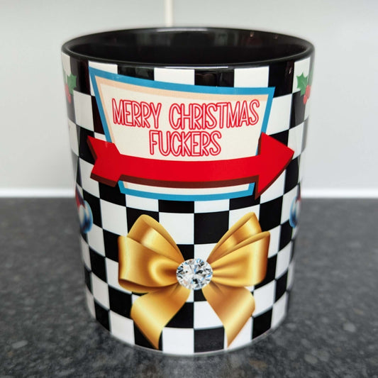 Merry Christmas F*ckers Cheeky Festive 1950s Style Pin-Up Mug – 11oz Black Handle – Funny Holiday Gift for Adults Limited Edition