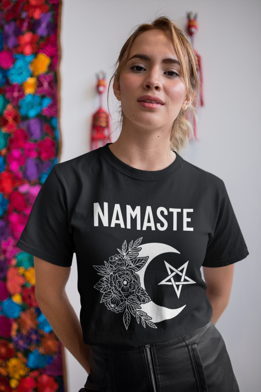 Namaste Cotton T-Shirt Pagan Clothing with moon, flowers and pentagram