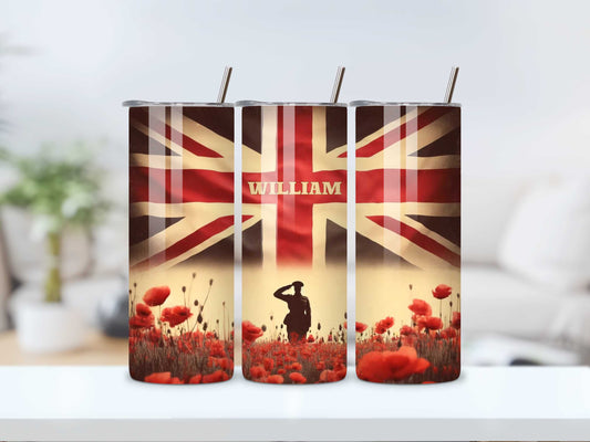 Personalised Union Jack Poppy Tumbler - World War 2 Tribute, Custom Name, 20oz Stainless Steel