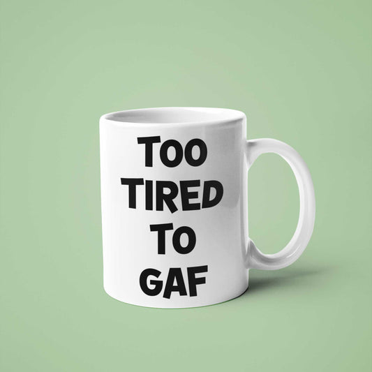 Too Tired To GAF Funny Coffee Mug – Perfect Sarcastic Gift for Tired Mums, Overworked Friends, Colleagues | 11oz & 15oz Options | Colour Handles Available | Ideal for Birthdays, Christmas, Mother’s Day, Secret Santa