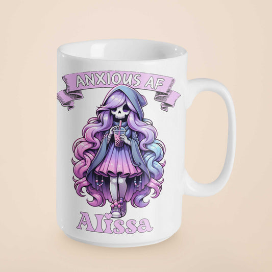 Anxious AF Grim Reaper Boba Tea Mug - Personalised Name Gift | Cute Goth Boba Mug for Teens | Funny Anxiety Cup | Halloween, Birthday, Mental Health Awareness Gift
