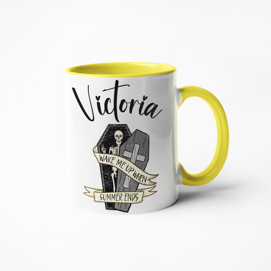 Wake me up summer ends skeleton in coffin any name personalised 11oz mug or 15oz cup