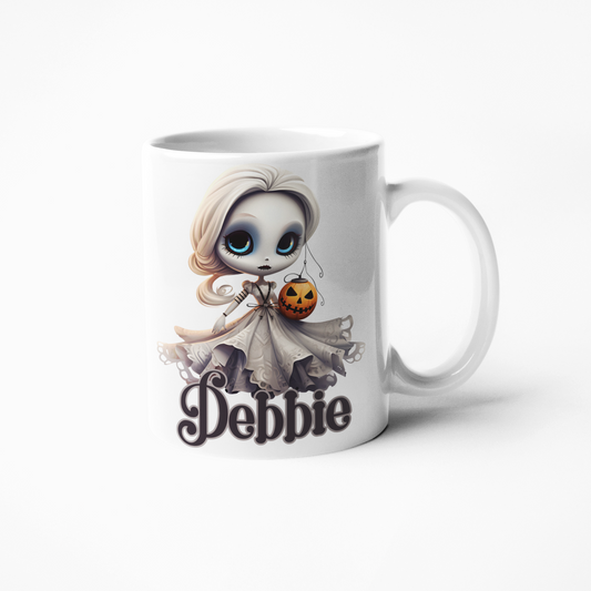 Dead doll girl with pumpkin Halloween gothic style personalised 11oz mug or 15oz big cup