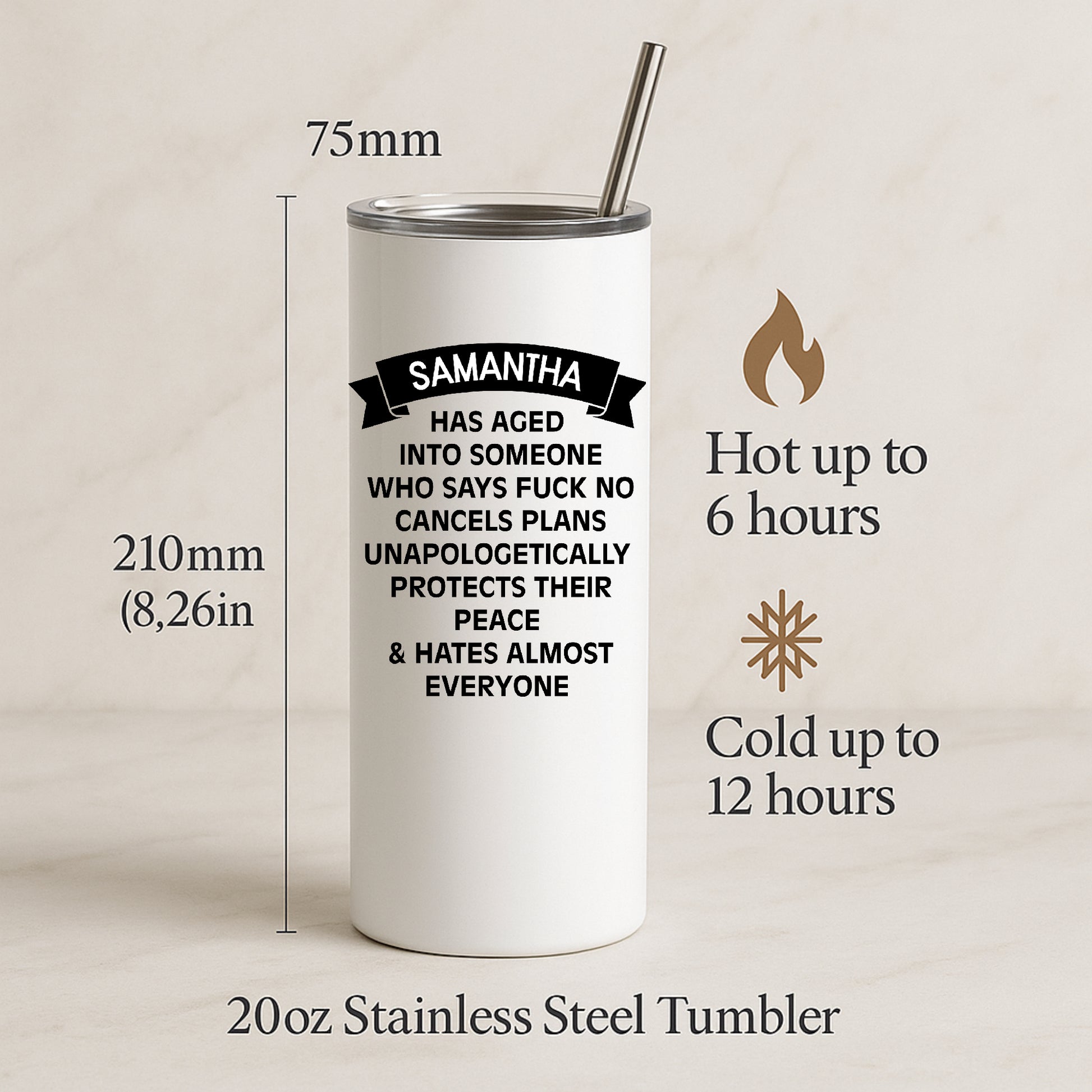 The 20oz insulated tumbler keeps drinks hot for up to 6 hours and cold for up to 12 hours.