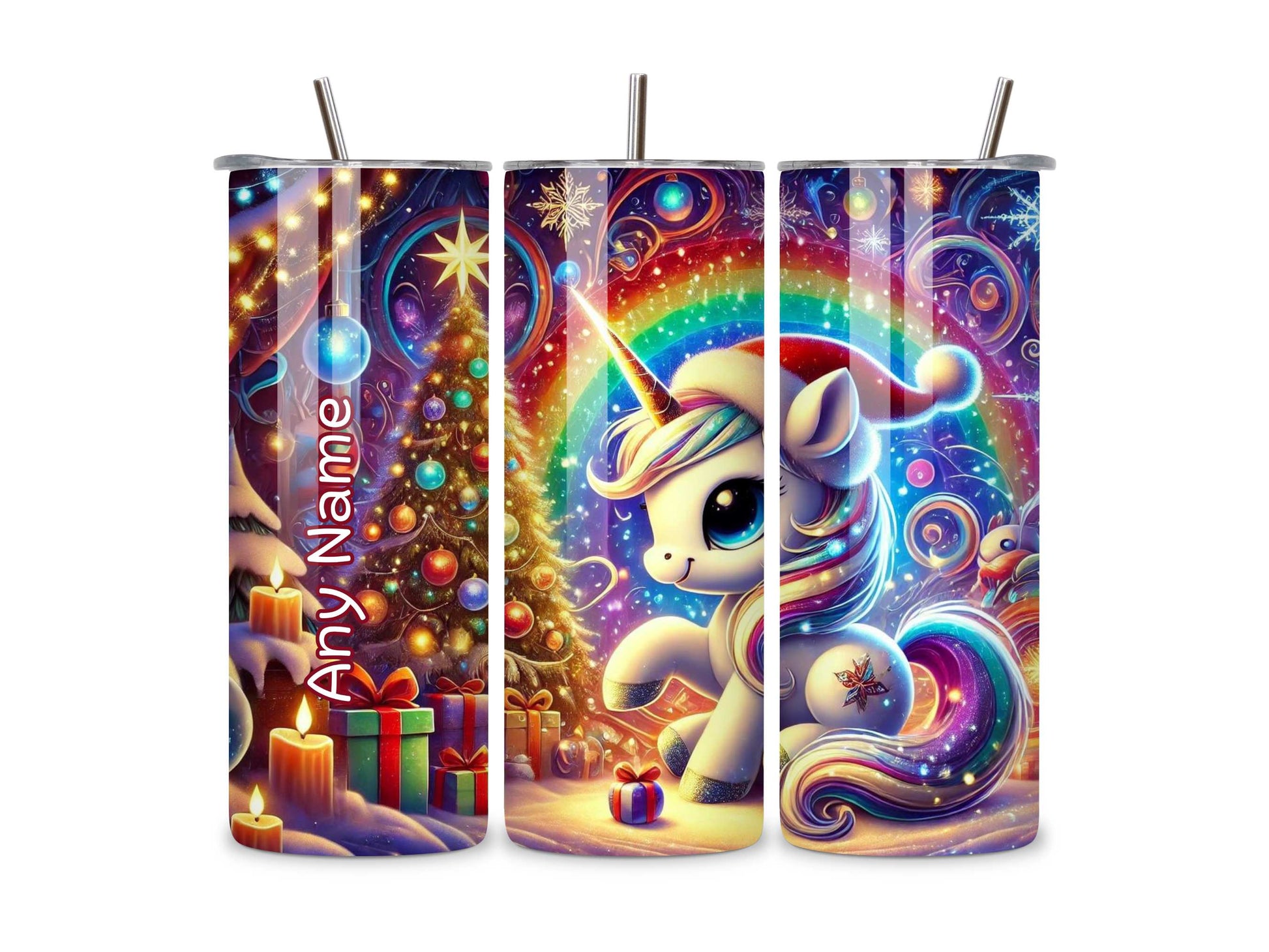 Personalised Unicorn Christmas Tumbler, Festive Kids Drinkware, Stainless Steel Insulated Tumbler with Straw
